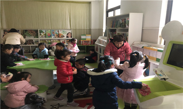 通过家长志愿者带领幼儿参加校园劳动活动,激发幼儿主动自觉地用实际行动来为幼儿园做一些力所能及的事情。瞧!家长志愿者带着小朋友们为幼儿园擦幼儿园大门、擦扶梯、擦公共区域椅柜;还来到了幼儿园图书馆,认真地整理和擦拭;紧接各班还通过学歌曲《学习雷锋好榜样》、听雷锋叔叔的故事、为他人做好事等形式帮助幼儿了解雷锋,知道雷锋叔叔是一位经常帮助别人、全心全意地为人民做好事的解放军叔叔,让小朋友们感受雷锋叔叔乐于助人、艰苦朴素的良好品质。