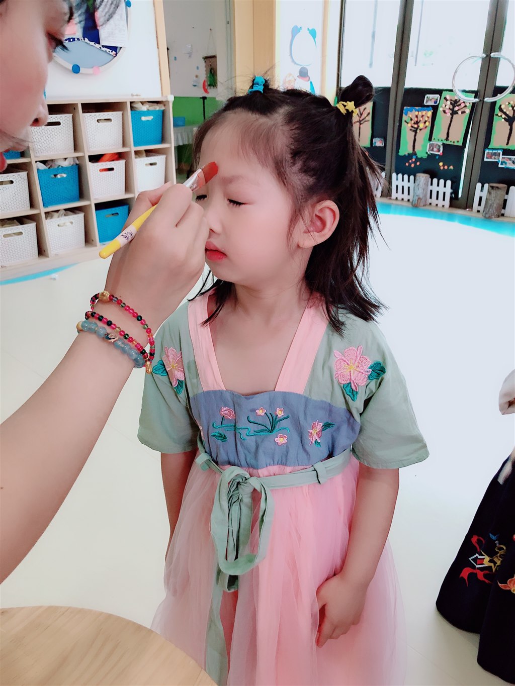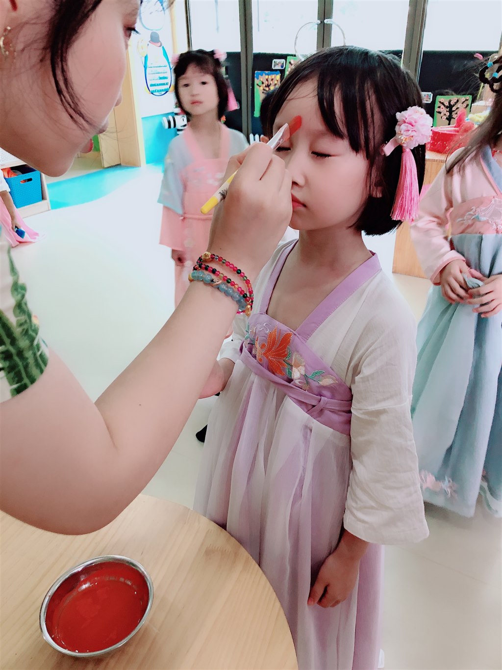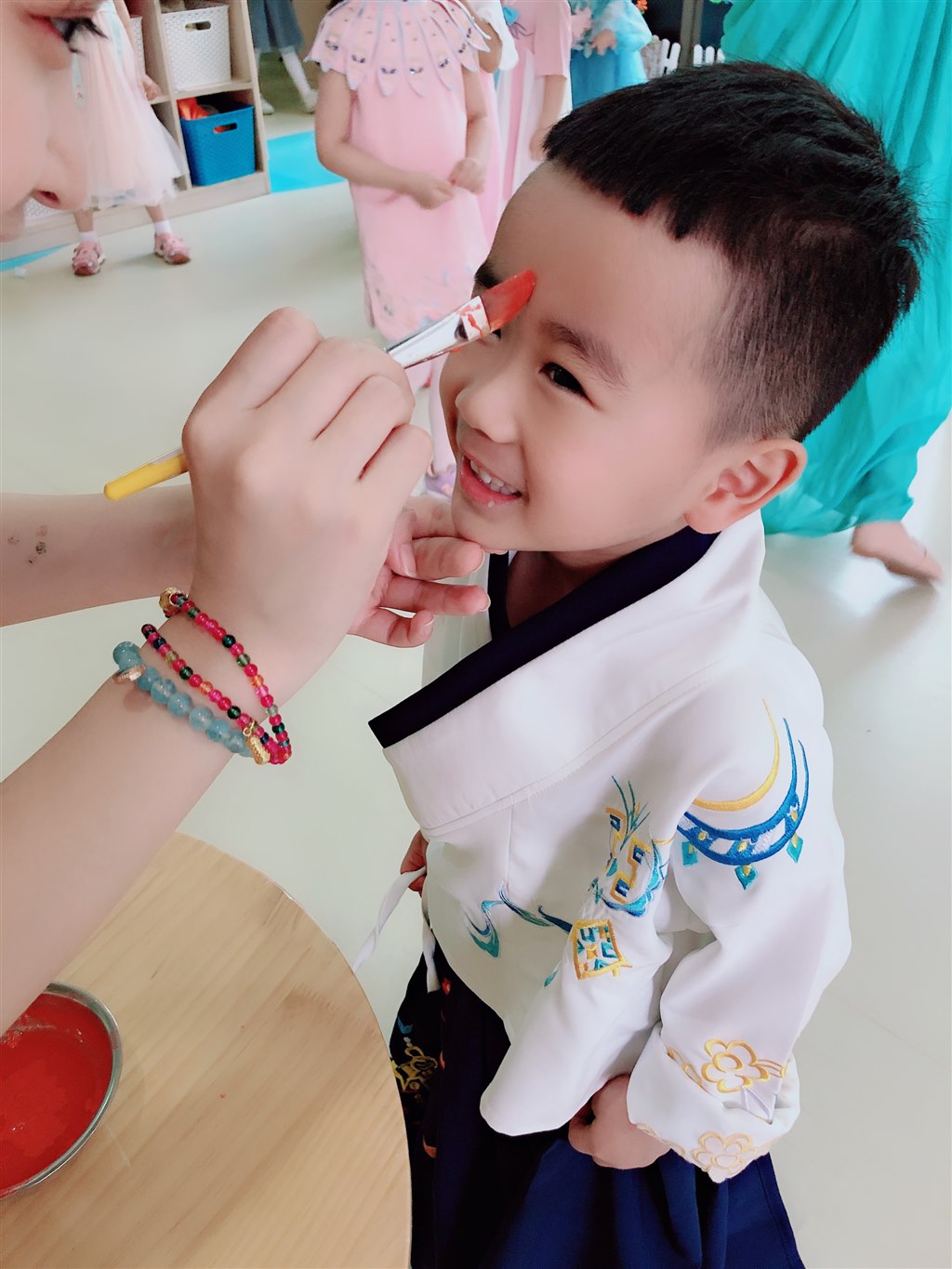 随后,教师带领孩子们在额头用雄黄点上一个红点,可以驱邪避妖,防止蛇毒的侵害,孩子们对于额头的红甚是兴奋不已。