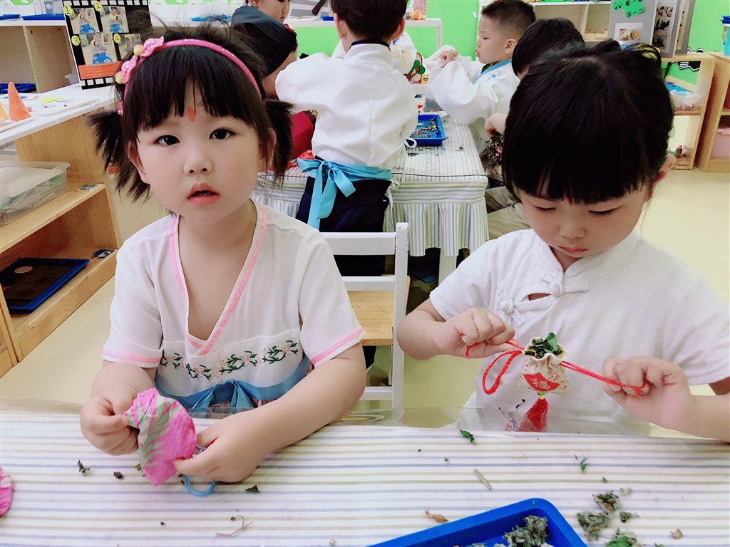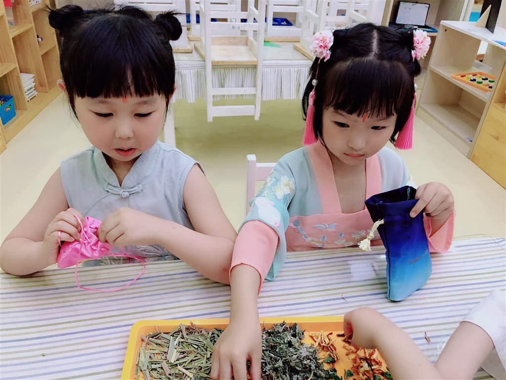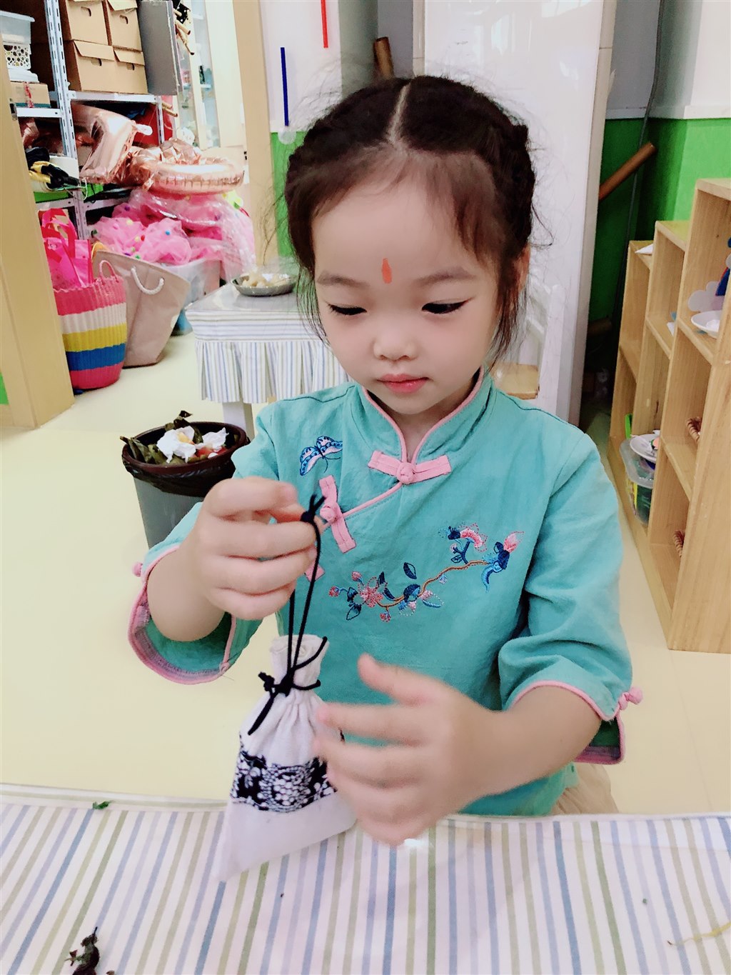 到了孩子们最激动的时刻了,一个个漂亮的香囊早就已经准备好,亲手制作驱蚊香包对小班小孩来说也是动手实践的一种挑战.老师在盘子里放上了很多味药草,有丁香,艾叶,白芷,苏叶,薄荷,藿香和金银花。小朋友们需要每样取一点,放在香囊里。瞧,香囊做好啦!