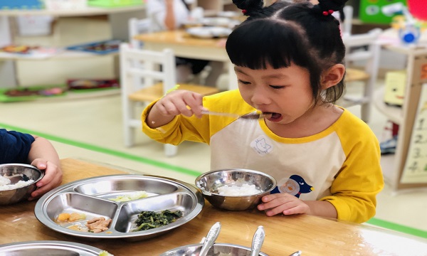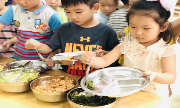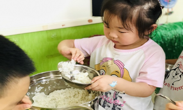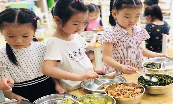 孩子们会用正确的动作姿势打饭装菜,不但如此,他们自己吃多少,就会给自己盛多少,既避免了粮食的浪费,又不断促成良好饮食习惯的养成。看他们一个个的小手多灵活!