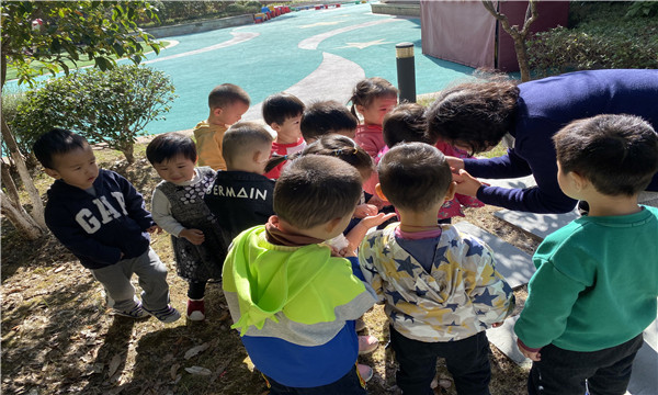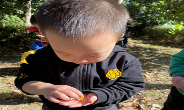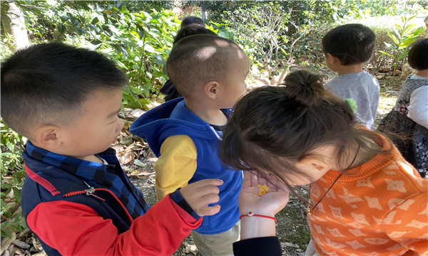 10月16日早上,户外活动时,孩子们时不时地跑到桂花树下,仰起头享受着扑鼻而来的丝丝花香,有的孩子还会指着树上的桂花讨论着什么,有的孩子甚至直接捡起地上飘落下来的桂花研究起来,他们对于这些小小的黄色花朵充满了兴趣。由此老师们从幼儿的兴趣点出发,因势利导地及时捕捉教育契机,组织了一次赏桂花、摘花的活动。通过活动,我们小班的孩子近距离地观赏了桂花,孩子们了解了桂花的花瓣形态、数量,还在老师的讲解下认识了不同种类的桂花,金黄色的是金桂,丹红色的是丹桂,米白色的是银桂,浅黄色的是月桂。