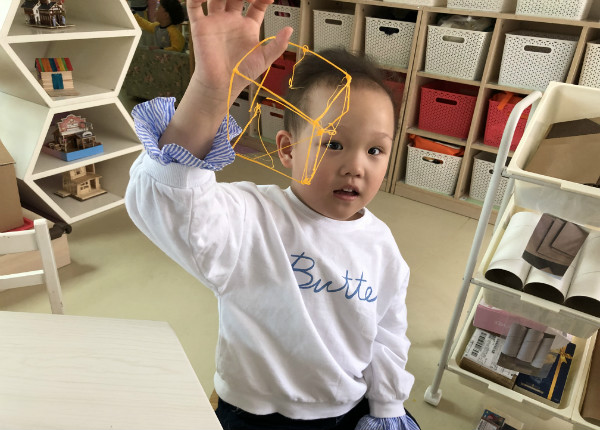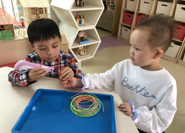 10月23日下午的区域活动在音乐声中开始了。瞧,洽洽和晨晨小朋友已经迫不及待地探索起来啦!洽洽先按下笔上的按钮,预热机器。当笔上的灯从红色跳至绿色后,洽洽控制笔的一端,晨晨从一端将耗材塞入它的身体,创作便就此开始了。结合教室里开展的stem主题---小兔的旅行屋,两位小朋友对于3D打印笔的初体验定位在了房子的框架上,看!他们完成了自己的房子轮廓,虽然线条不是那么地平滑,但对于孩子来说,却是不小的挑战。