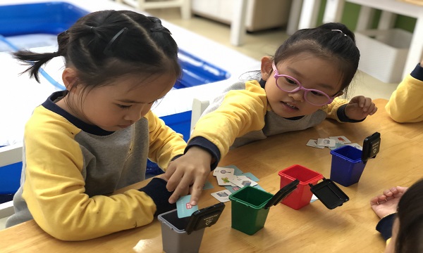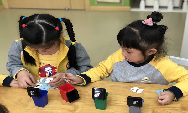 桌子上摆放着绿色、红色、蓝色、灰色四个玩具垃圾桶,老师带领孩子在游戏中学习垃圾分类的知识,孩子不确定的时候,老师就鼓励他们自己查阅垃圾分类手册找到答案。孩子们通过操作互动的方式,在实践体验中加深理解,确保平时常见的各类垃圾能准确分类和投放。“老师,这个纸可以放在这里,它还可以再变成有用的东西。”“你看,这个瓶子也可以。”孩子们拿起操作栏里的“垃圾”热烈的讨论起来,别看我们宝宝小,我们也聪明着呢!