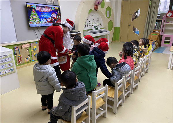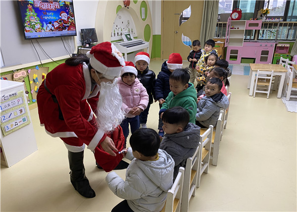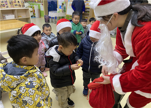 “Jingle bells, jingle bells……”在熟悉欢快的音乐声中,圣诞老人满载着幸福的讯息来到了和记黄陂幼儿园小小班。圣诞节虽然是“舶来品”,但也给我们的生活增添了不少乐趣。为了让宝贝们了解圣诞节的风俗和来历,感受圣诞节的欢乐气氛,了解西方文化,我们小小班于2019年的12月25日开展了形式多样的圣诞节联欢活动。瞧!老师们已提前精心装扮了幼儿园,绿色的圣诞树,金色的铃铛,红色的靴子,白色的雪花,红白相映成趣的圣诞老人,这一切的一切都给节日增添了欢乐洋溢的气氛。
