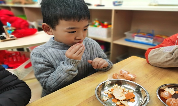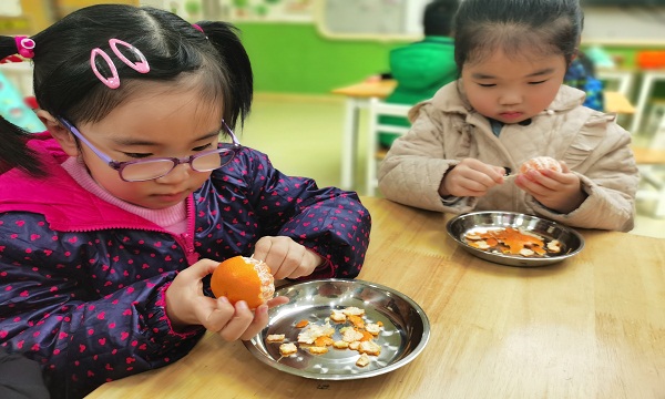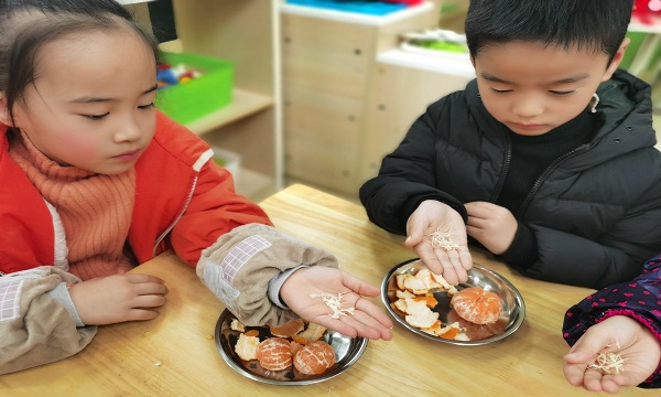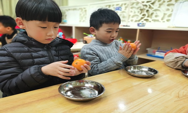 橘子是孩子们生活中比较熟悉的水果之一。本月初到12月30日这段时间,孩子们通过看一看、画一画、闻一闻、采一采、玩一玩、尝一尝等方式,充分运用多种感官,发现橘子的特征和玩法。