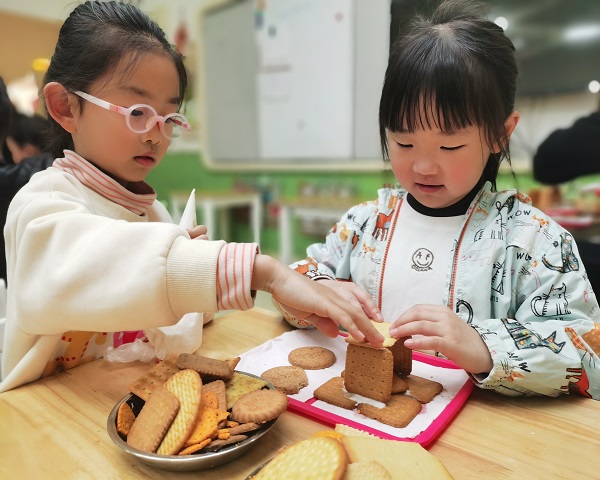 在制作完成之后,孩子们一起数一数“我的饼干屋”都用到了哪些形状的饼干,各几块,一起记录了下来,并把这个以开放性的方式,投放到区域里,让幼儿探索更多的玩法。(撰稿:是颖洁 审核:蒋丽君)