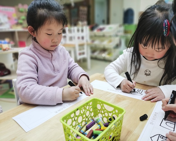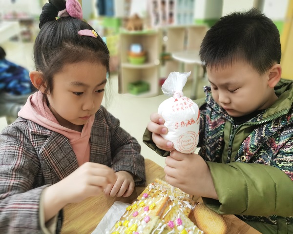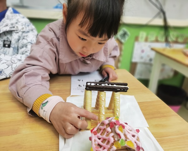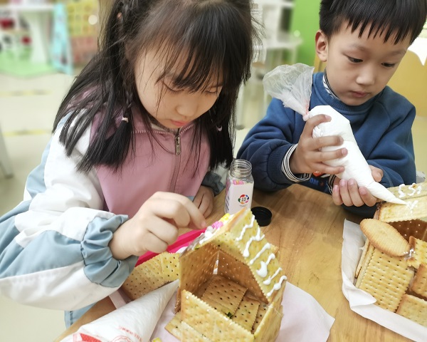 先把糖霜进行打发,糖霜就变得和胶水一样黏黏的,就可以把房子粘起来啦!孩子们先画了设计图,把自己对房子的想象画了下来,接着我们便开始一起动手制作饼干屋啦!“一层一层又一层”“我要用糖霜画出房子的屋顶和窗户”“我还要用小爱心把饼干屋装饰的美美的!”大家你一言我一语的开始了制作……