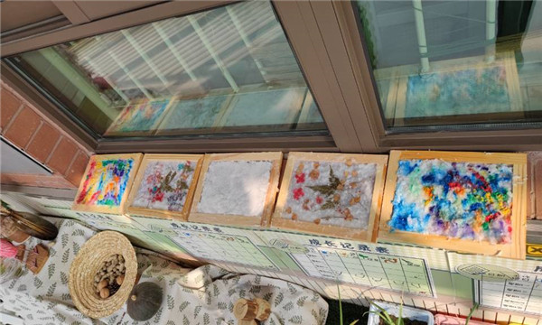 老师先讲解、示范造纸的过程,接着小朋友们忙开啦。他们正在一步步尝试着造纸的工序:将废纸撕小、浸湿、搅拌、加色、铺平、沥水、风干……一次次的失败,他们毫不气馁,总结经验继续努力。哇,他们终于成功了!看着晾在窗台上的纸,孩子们兴奋不已!