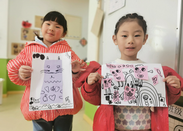 首先,每人利用一张彩色手工纸撕出自己喜欢的形状。长的,短的,粗的,细的,各种不规则的图形。撕好后,让孩子根据撕的图形进行借形想象添画,看看自己撕的纸像什么小动物,进行添画动物的五官特征。最后添画小动物生活环境或者小动物在做什么进一步丰富作品内容。当一幅幅作品在他们的巧手下完成后,孩子们的脸上都露出了成功的喜悦。