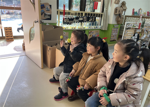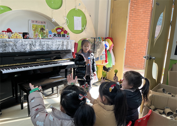 孩子们已经能很熟练地播报天气啦,3月3日这一天他们要结合乐器,进行一次别具一格的天气播报呢,快看!他们用沙锤表示阴雨天气,用敲击小鼓的声音表示晴天;用铃鼓表示微风;用双响桶表示多云……3-4人一组轮流上台进行打击乐播报表演,边配乐边加上简单的语言描述,时不时还调整打击的速度和频率来表示天气的变化呢!