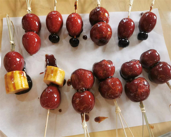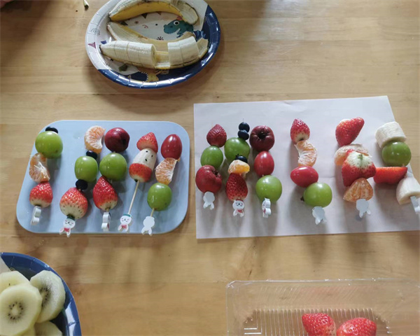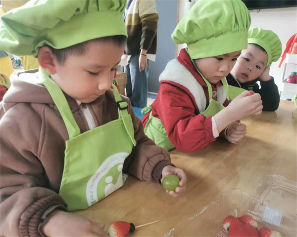 家长老师准备了各种各样的水果,熬了一大锅糖稀,还有黑芝麻。小朋友们洗干净小手,穿上小围裙开始制作糖葫芦。首先,家长老师向小朋友们示范了小雪人糖葫芦的制作方法,竹签上串上切好的草莓屁屁做小雪人的身体、一段香蕉做小脸、草莓尖尖做小帽子,还有黑芝麻做成眼睛,裹上糖稀晾凉,就成了美味又好看的小雪人糖葫芦啦!小朋友们认真学习后就开始兴致勃勃地动起手来......