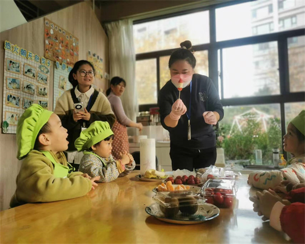 12月4日上午,和记黄埔幼儿园的小厨房里又开始热闹起来,原来是小三班的家长老师来园带孩子们一起做冰糖葫芦啦!