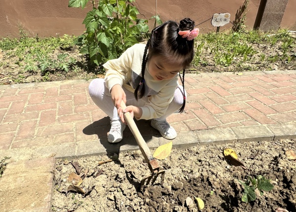 孩子们在老师的带领下挽起袖子,拿着小铲子,快乐地忙着培土,种下玉米。嘿哟嘿哟,扛起我的小锄头,一下又一下。孩子们发现:哎呀,原来这锄地还真不容易呢!泥土又硬又难翻,好不容易地翻好了,就来挖玉米苗的坑,要量好距离在地里挖出一个个小坑。然后把玉米小苗轻轻地放下去,再抓一些土进行覆盖,压实,就栽好啦!随后,孩子们拿着小水壶蹲在它们身边给它浇水、施肥。