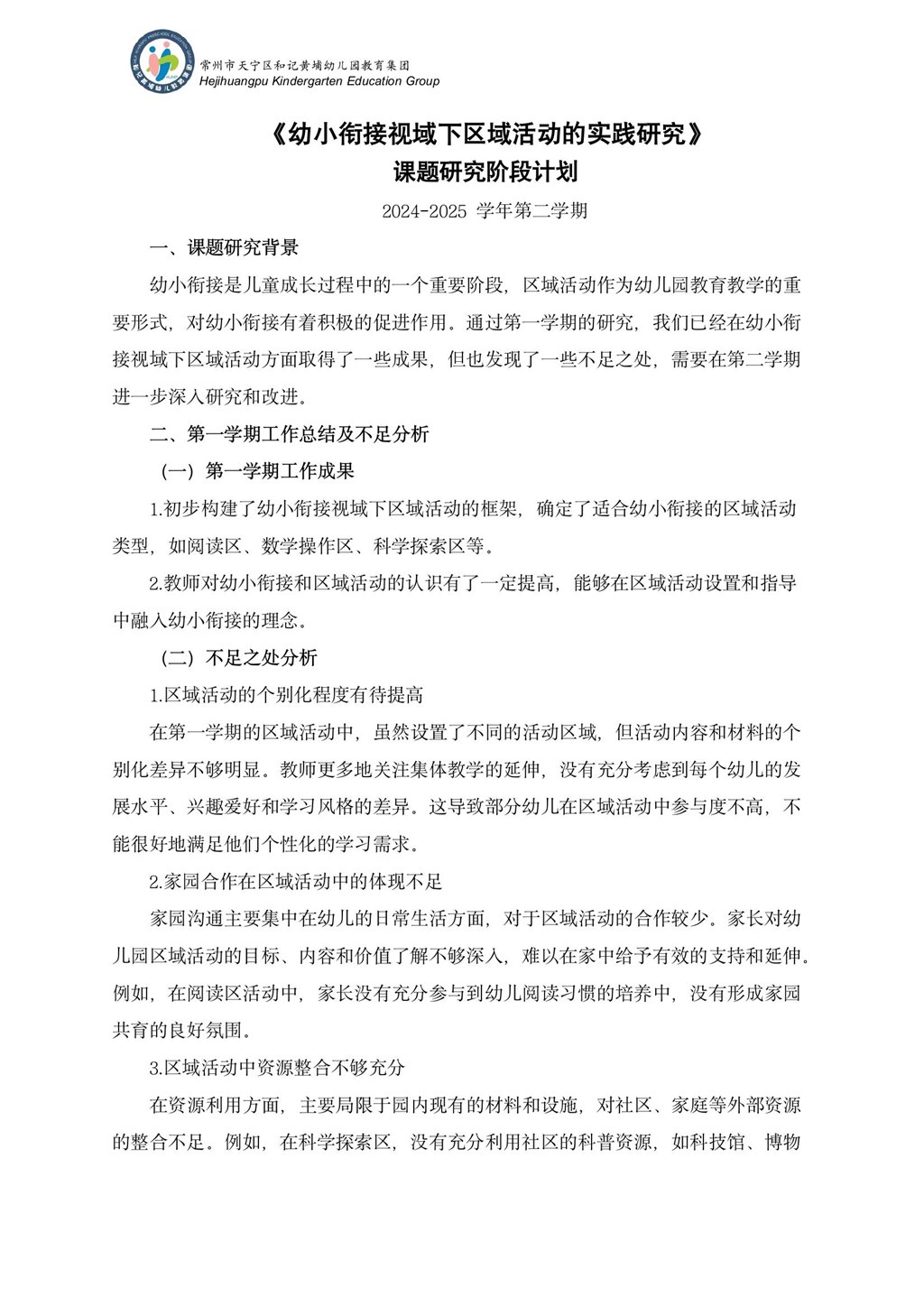 【计划总结】《幼小衔接视域下区域活动的实践研究》 课题研究阶段计划(2024-2025学年第二学期)