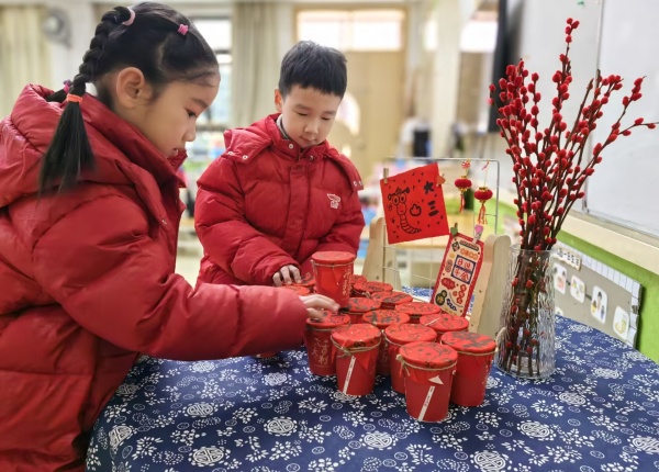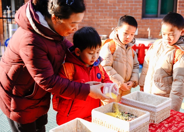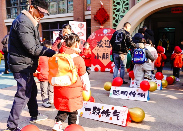 迎接清晨的第一缕阳光,孩子们在爸爸妈妈、老师的带领下依次跨过祝福跨栏,活力满满迈向新学期,开启新篇章。摸一摸苹果、桔子、可乐、葱、棒棒糖、敲一敲鼓,这些“仪式感”十足的传统民俗活动,让孩子们沉浸在欢乐的开学氛围中。孩子们从家里带来了五谷杂粮或者米,汇聚成百家米,寓意得到百家福气,护我们健康长寿平安。希望孩子们在新的一年有趣有盼,福气不止。“加油,加油,我赢啦……”开学第一天幼儿园里的喝彩声,加油声此起彼伏,热闹不已,好玩的福气滚滚、沾沾福气、欢乐套福、福气盲盒等游戏让孩子们玩的不亦乐乎。